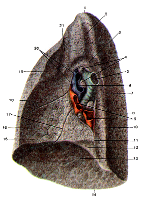 Рис. 4.7. Правое легкое. Медиальная (внутренняя) поверхность. 1-верхушка легкого: 2-борозда подключичной артерии; 3-вдавление непарной вены; 4-бронхо-легочные лимфатические узлы; 5-правый главный бронх; 6-правая легочная артерия; 7-борозда -непарной вены; 8-залний край легкого; 9-легочные вены; 10-пи-шеводное вдавление; 11-легочная связка; 12-вдавление нижней полой вены; 13-диафрагмальная поверхность (нижняя доля легкого); 14-нижний край легкого; 15-средняя доля легкого:. 16-сер-дечное вдавление; 17-косая щель; 18-передний край легкого; 19-верхняя доля легкого; 20-висцеральная плевра (отрезана): 21-борозда правой и лечеголовной вены