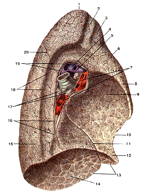 Рис. 4.8. Левое легкое. Медиальная (внутренняя) поверхность. 1-верхушка легкого, 2-борозда левой подключичной артерии, 2-борозда левой плечеголовной вены; 4-левая легочная артерия, 5-лсвый главный бронх, 6-передний край левого легкого, 7-ле-гочные вены (левые), 8-верхняя доля левого легкого, 9-сердечное вдавление, 10-сердечная вырезка левого легкого, 11-косая щель, 12-язычок левого легкого, 13-нижний край левого легкого, 14-диафрагмальная поверхность, 15-нижняя доля левого легкого, 16-легочная связка, 17-бронхолегочные лимфатические узлы, 18-борозда аорты, 19-висцеральная плевра (отрезана), 20-косая щель.