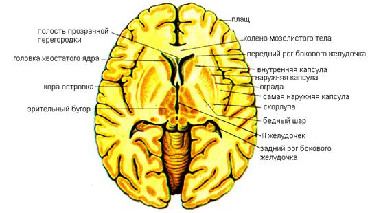 Рис. 10.4. Горизонтальный разрез головного мозга. Базальные ганглии.