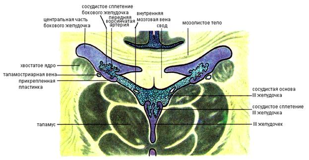 Рис. 10.6. Фронтальный разрез головного мозга на уровне центральной части боковых желудочков.