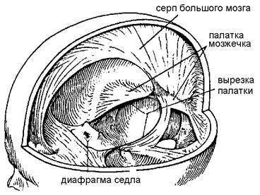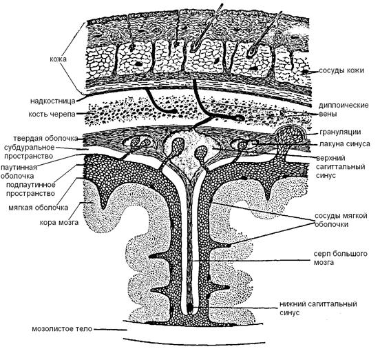 Рис. 10.7. Оболочки головного мозга на фронтальном разрезе.