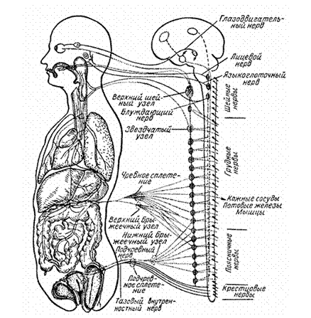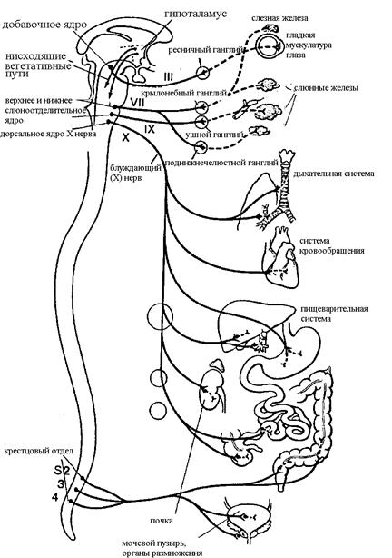 Рис. 10.11. Вегетативная нервная система. Симпатические ядра (центры) заштрихованы, узлы и нервы (волокна) показаны пунктиром, парасимпатические нервы–черными линиями.