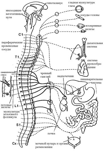 Рис. 10.12. Органы, иннервируемые симпатической системой.