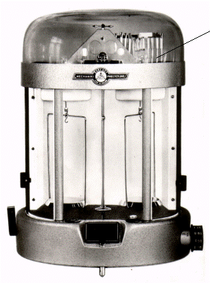 Аналитические весы применяют для точных анализов. Точность этих весов 10-4 - 10-5 г. Устройство аналитических весов отражено на рис. 1. Весы заключены в витрину с боковыми дверцами. Витрина закреплена на основании, на котором также крепится колонка (7). На колонке крепятся два кронштейна с воздушными успокоителями колебаний - демпферами (8). На вершине колонки помещена опорная площадка, на которую опирается средняя призма коромысла (1). На концах коромысла имеются грузоприемные призмы, на них подвешиваются серьги с грузоприемными площадками. На верхние крючки серег подвешиваются чашечки весов (3). Весы снабжены встроенными разновесами (2).