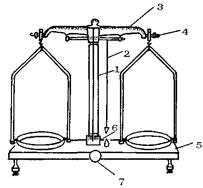 1-вертикальная колонка; 2-отвес; 3-коромысло; 4-гайка для корректирования весов; 5-подставка весов; 6-шкала с делениями; 7-арретир.