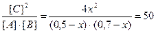Равновесные концентрации реагирующих веществ будут: [ A ] = (0,5-х) моль/л; [ B ] = (0,7-х) моль/л; [ С ] = 2х моль/л.