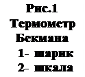 1. Подготовить к работе термометр Бекмана (рис1). Особенностями этого термометра являются большая длина шкалы (примерно 5 см на 1 0С) и наличие вверху термометра запасного резервуара с ртутью, позволяющего изменять количество ртути в рабочей части термометра и тем самым температурные интервалы измерения. Шкала термометра разделена на 5 0С, а каждый градус на десятые и сотые доли. Тысячные доли могут быть подсчитаны при наблюдении в лупу.