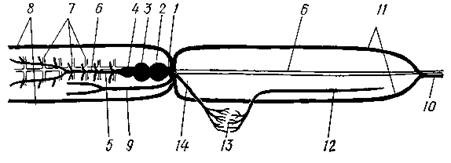 Пищеварительная система. Ротовое отверстие, лежащее в глубине присасывательной воронки, ведет в ротовую полость (рис. 12, 13). Глотка у миноги имеется только на стадии личинки. Во время метаморфоза она разделяется на два самостоятельных отдела: пищевод и дыхательную трубку. Пищевод (рис. 12, 14; рис. 13, 10) начинается от задней части ротовой полости, идет под хордой и, обогнув сердце, незаметно переходит в кишку (рис. 12, 15; рис. 13, 16).Кишка тянется над печенью, далее идет назад без изгибов по нижней поверхности брюшной полости и заканчивается анальным (заднепроходным) отверстием. Внутренняя часть слизистой оболочки кишечника образует продольную складку, вдающуюся в полость кишки и увеличивающую всасывающую поверхность кишечника – ее называют спиральным клапаном (рис. 13, 17).