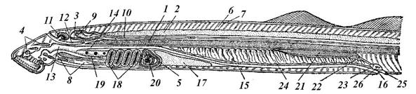Рис. 12. Продольный разрез речной миноги: 1 – хорда, 2 – соединительнотканная оболочка хорды, 3 – мозговой череп, 4 – хрящи ротовой воронки, 5 – околосердечный хрящ, 6 – миомер, 7 – миосепта, 8 – мускулатура языка, 9 – головной мозг, 10 – спинной мозг, 11 – обонятельный мешок, 12 – питуитарный вырост, 13 – ротовая полость, 14 – пищевод, 15 – кишка, 16 – анальное отверстие, 17 – печень, 18 – жаберные мешки, 19 –дыхательная трубкас внутренними отверстими жаберных мешков, 20 –сердце, 21 – почка, 22 – мочеточник, 23 – мочеполовой синус, 24 – половая железа, 25 – мочеполовой сосочек, 26 – половая пора