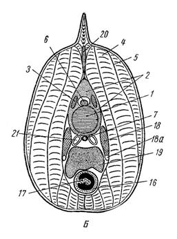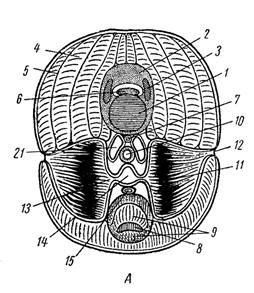 Рис. 13. Поперечный разрез речной миноги: А – в области жаберных мешков; Б – в области кишки: 1 – хорда, 2 – соединительнотканная оболочка хорды, 3 – хрящевые зачатки верхних дуг, 4 – миомер, 5 –миосепта, 6 – спинной мозг, 7 – спинная аорта, 8 –хрящ языка, 9 –мускулатура языка, 10 – пищевод, 11 – жаберный мешок, 12 – наружное отверстие жаберного мешка, 13 – внутреннее отверстие жаберного мешка, 14 – дыхательная трубка, 15 – брюшная аорта, 16 – кишка, 17 –спиральный клапан, 18 – почка, 18а – мочеточник, 19 –половая железа, 20 – плавнико- вый луч, 21 – лимфатические полости, 22 – задние кардинальные вены |
