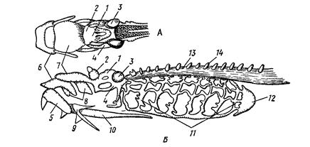 Рис. 14. Скелет миноги. А – вид сверху; Б – вид сбоку. 1 – черепная коробка, 2 – обонятельная капсула, 3 –слуховая капсула, 4 –подглазничная дуга, 5 – кольцевой хрящ, 6 –передний верхний хрящ, 7 – задний верхний хрящ, 8 – боковые хрящи, 9 – палочковидные хрящи, 10 – подъязычный хрящ, 11 – жаберная решетка, 12 – околосердечный хрящ, 13 –хорда, 14 – зачат- ки невральных дуг