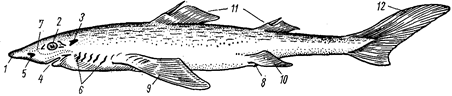 Рис. 15. Внешний вид колючей акулы (катрана): 1 – рыло, 2 – глаз, 3 – брызгальце, 4 – рот, 5 – ноздря, 6 – жаберные щели, 7 – отверстия органа боковой линии, 8 – клоака, 9 – грудной плавник, 10 – брюшной плавник, 11 – спинные плавники, 12 – хвостовой плавник