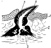 | Рис. 16. Схематический разрез через кожу и плакоидную чешую акуловой рыбы: 1 – эпидермис, 2 – кориум, 3 – дентин, 4 – эмаль, 5 – внутренняя полость плакоидной чешуи |