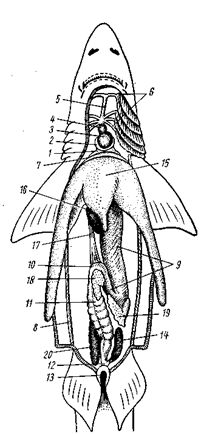 | Рис. 17. Общее расположение внутренних органов колючей акулы: 1 – венозный синус, 2 –предсердие, 3 – желудочек, 4 – артериальный конус, 5 – брюшная аорта, 6 – приносящие жаберные артерии, 7 – кювьеров проток, 8 – боковая вена, 9 – желудок, 10 – тонкая кишка, 11 – толстая кишка (просвечивает спиральный клапан), 12 – прямая кишка, 13 – клоака, 14 – ректальная железа, 15 – печень, 16 – желчный пузырь, 17 – желчный проток, 18 – поджелудочная железа, 19 – селезенка, 20 – правая почка (левая не изображена) |