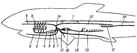 Рис. 18. Схема кровеносной системы акулы: 1 – венозная пазуха, 2 – предсердие, 3 – желудочек, 4 – артериальный конус, 5 – брюшная аорта с отходящими от нее приносящими жаберными артериями, 6 – выносящие жаберные артерии, 7 – спинная аорта, 8 – передняя кардинальная вена, 9 – яремная вена, 10 – хвостовая вена, разделяющаяся на воротные вены почек, 11 – воротная система почек, 12 – задняя кардинальная вена, 13 – боковая вена, 14 – кювьеров проток, 15 – воротная вена печени, 16 – воротная система печени, 17 – печеночная вена. |