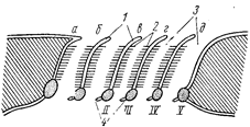 | Рис. 19. Схема жаберного аппарата акулы: 1 – межжаберная перегородка, 2 – жаберные лепестки, 3 – жаберная щель, 4 – жаберные тычинки, I–V – жаберные дуги, а – первая полужабра, б, в, г, д – целые жабры |