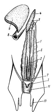 Железы пищеварительного тракта у акуловых рыб хорошо развиты. Массивная трехлопастная печень (рис. 17, 15) занимает переднюю часть брюшной полости. Вырабатываемая в печени желчь собирается в желчный пузырь (рис. 17, 16), связанный с тонкой кишкой отчетливо заметным желчным протоком (рис. 17, 17). Компактная поджелудочная железа (рис.17, 18) прилегает к тонкой кишке, сообщаясь с ней мелкими (на препарате не видны) протоками.