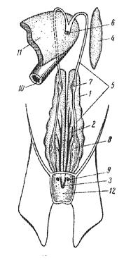 | Рис. 20. Схема мочеполовой системы самца акулы: 1 – почка, 2 – мочеточник, 3 – мочеполовой сосочек, 4 – левый семенник (правый семенник не изображен), 5 – семявыносящие канальцы, 6 – семяпровод, 7 – ceмeннoй пузырек, 8 – семенной мешок, 9 – печень, 10 – копулятивный отросток брюшного плавника, 11 – по- лость клоаки | Рис. 21. Схема мочеполовой системы самки акулы: 1 – почка, 2 – мочеточник, 3 – мочевой сосочек, 4 – левый яичник (правый яичник не нарисован), 5 – яйцевод, 6 – общая воронка обоих яйцеводов, 7 – скорлуповая железа, 8 – «матка», 9 – отверстие яйцевода, 10 – пищевод, 11 –печень, 12 – полость клоаки |