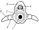 Каждый позвонок состоит из тела позвонка (рис. 22, 2), имеющего цилиндрическую форму. Передняя и задняя поверхности тела позвонка вогнуты; такие позвонки называются двояковогнутыми или амфицельными. Пространство, образованное вогнутыми поверхностями тел соседних позвонков, заполнено хордой. В центре тел позвонков имеется сквозной продольный канал, также заполненный хордой (рис. 22, 1). От верхнебоковых поверхностей тел позвонков отходят парные выросты, вверху смыкающиеся друг с другом; они образуют верхние дуги (рис. 22, 3). Верхние дуги имеют широкое основание и суженную вершину. В местах соединения соседних позвонков между верхними дугами вклиниваются хрящевые вставочные пластинки; при рассматривании сбоку они имеют вид треугольников, направленных вершинами книзу. В канале, образованном верхними дугами и вставочными пластинками, располагается спинной мозг (рис. 22, 4).