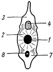 | Рис. 22. Поперечный разрез позвонков акулы. А – туловищный позвонок, Б – хвостовой позвонок: 1 – хорда, 2 – тело позвонка, 3 – верхняя дуга, 4 – спинной мозг, 5 – поперечный отросток, 6 – ребро, 7 – нижняя дуга, 8 – гемальный канал |