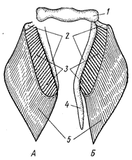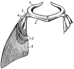 | Рис. 24. Плечевой пояс и скелет грудного плавника акулы: 1 – лопаточный отдел плечевого пояса, 2 – коракоидный отдел плечевого пояса, 3 – сочленовный вырост, 4 – базальные хрящи скелета грудного плавника, 5 – ряды радиальных хрящей, 6 – эла- стотрихии | Рис. 25. Тазовый пояс и скелет брюшных плавников акулы. А – плавник самки; Б – плавник самца: 1 – тазовая пластинка, 2 – базальный хрящ брюшного плавника, 3 – радиальные хрящи, 4 – копулятивный вырост базального хряща брюшного плавника сам- ца, 5 – эластиновые нити |