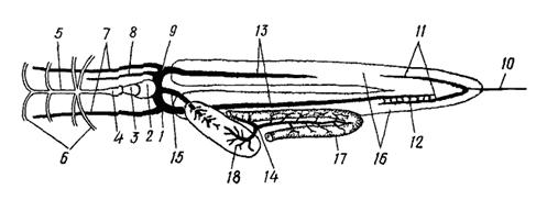 Рис. 28. Схема кровеносной системы костистой рыбы (вид снизу; не показаны выносящие жаберные артерии, их слияние в спинную аорту и ветвление последней): 1 – венозная пазуха, 2 – предсердие. 3 – желудочек, 4 – луковица аорты, 5 – брюшная аорта, 6 – приносящие жаберные артерии, 7 – передние кардинальные вены, 8 – яремная вена, 9 – кювьеров проток. 10 – хвостовая вена, 11 – воротные вены почек, 12 – анастомозы между воротной веной правой почки и правой задней кардинальной веной, 13 – задние кардинальные вены, 14 – воротная вена печени, 15 – печеночная вена, 16 – почки. 17 – кишечник, 18 — печень