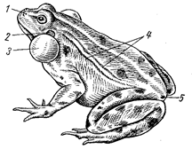 | Рис. 1. Внешний вид самца прудовой лягушки: 1 – ноздря, 2 – барабанная перепонка, 3 – резонатор, 4 – спинно-боковые складки, 5 – отверстие клоаки |