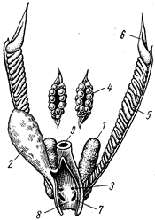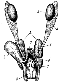Половые железы самцов – парные семенники (рис. 17, 3) – подвешены на брыжейке в задней спинной части брюшной полости. Семенники при помощи семявыносящих канальцев тесно связаны с придатками семенников (рис. 17, 4), от которых идут семяпроводы (рис. 17, 5). Перед самым впадением в клоаку семяпроводы сливаются с мочеточниками и открываются в клоаке общими отверстиями (рис. 17, 6). Придатки семенника представляют собой остатки переднего отдела туловищной (мезонефрической) почки, а семяпроводы гомологичны выводному протоку этой почки – вольфову каналу. Мюллеровы каналы у самцов не развиваются. В боковых стенках клоаки у самцов располагаются два полых выроста, которые могут выворачиваться через отверстие клоаки наружу. Они играют роль совокупительных органов.