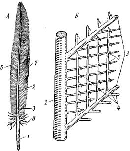 | Рис. 1. Строение махового пера. А – общий вид; Б – схема строения опахала (сильно увеличено): 1 – очин, 2 – стержень, 3 – бородки, 4 – бородочки, 5 – крючочки, 6 – наружное опахало, 7 – внутреннее опахало, 8 – пуховая часть опахала |