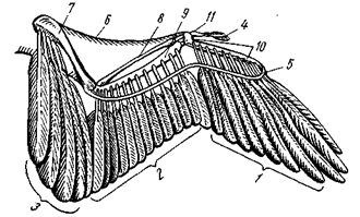 1 – первостепенные маховые, 2 –второстепенные маховые, 3 –третьестепенные маховые, 4 – крылышко, 5 – связка, укрепляющая основания маховых перьев, 6 – кожистая лета тельная перепонка, 7 – плечо, 8 – лучевая кость, 9 –локтевая кость,