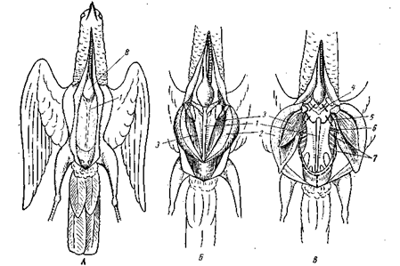 2. Сделать скальпелем разрез кожи посредине груди. Введя в разрез тупую ветвь ножниц, провести разрез вперед до основания шеи и назад до клоаки. Пальцами раздвинуть кожу в стороны от разреза (рис. 3, А); при этом обнажаются киль грудины (рис. 3, 1) и лежащие справа и слева от него мощные грудные мышцы (рис. 3, 2). При их сокращении крылья опускаются. Далее пальцами разорвите кожу на шее, стараясь не повредить лежащий под кожей у основания шеи тонкостенный зоб (рис. 3А, 8).