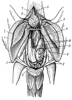 | Рис. 4. Общая топография внутренних органов голубя: 1 – большая грудная мышца, 2 – подключичная мышца, 3 –воздушные мешки (сохранившиеся), 4 – сердце, 5 – безымянные артерии, 6 – трахея, 7 – пищевод, 8 – зоб, 9 – мускульный желудок, 10 – печень, 11 – селезенка, 12 – петли кишечника |