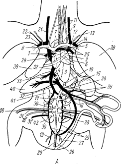 Воротная вена печени (рис. 5, 34) образована уже упоминавшейся копчиково-брыжеечной веной (рис. 5, 28) и несколькими венами (рис. 5, 35), несущими кровь от пищеварительного тракта. Почти сразу же после своего образования эта широкая вена разделяется на два коротких сосуда, входящих в правую и левую доли печени: здесь они распадаются на систему капилляров. Воротная вена печени лежит в складке брюшины, связывающей петлю двенадцатиперстной кишки с правой лопастью печени; ее можно увидеть, если приподнять кверху обе лопасти печени.