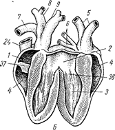 После зарисовки схемы кровеносной системы следует познакомиться со строением сердца. Для этого надо оттянуть его несколько кверху и назад, перерезать возможно дальше от сердца выходящие из него артерии и впадающие вены и выделить этот орган. Разрезать сердце вдоль так, чтобы на одной стороне были дуга аорты с отходящими от нее безымянными артериями, а на другой – легочные артерии (рис. 5, Б). Стенки левого желудочка значительно толще, чем правого; больше и его полость. Вход из левого предсердия в левый желудочек ограничивает трехстворчатый клапан (рис. 5, 36), створки которого сухожильными нитями прикрепляются к сосочковым мышцам стенки желудочка. Этот клапан не пропускает кровь в предсердие при сокращении желудочка. Вход из правого предсердия в правый желудочек закрывает более простой мышечный клапан (рис. 5, 37). Вводя иглу в правую дугу аорты и в одну из легочных артерий, можно увидеть, где они выходят из желудочков. Входы в артерии закрыты полулунными клапанами, которые не дают крови вновь возвращаться в желудочки, когда начинается их расширение (диастола).