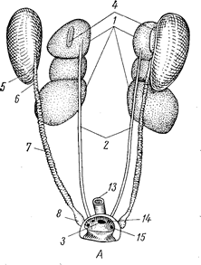 Мочеполовая система. Как и у всех амниот, парные почки (рис. 7, 1) птиц метанефрического типа. Они довольно велики по размерам, отчетливо дольчаты (у голубя состоят из трех долей) и лежат в углублениях тазового пояса, тесно с ним срастаясь. От внутренней поверхности каждой почки на границе между передней и средней лопастью отходит тонкая прямая трубочка – мочеточник (рис. 7, 2); он проходит сбоку от позвоночника и впадает в клоаку. На вентральной поверхности почек, около их переднего края, располагаются небольшие, обычно желтого цвета компактные тельца – надпочечные железы, или надпочечники (рис. 7, 4); у самцов они обычно прикрыты семенниками.