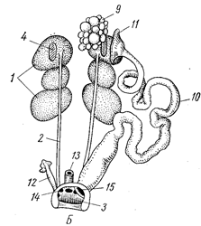 | Рис. 7. Мочеполовая система голубя. А – самец; Б – самка: 1 – почки, 2 – мочеточник, 3 – полость клоаки, 4 – надпочечник, 5 – семенник 6 –придаток семенника, 7 – семяпровод, 8 –семенной пузырек, 9 –яичник, 10 – левый яйцевод, 11 – воронка яйцевода, 12 – остаток редуцироваиного правого яйцевода, 13 – прямая кишка, 14 – мочевое отверстие, 15 –половое отверстие |