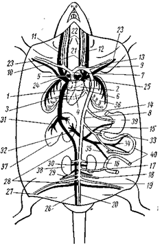 В брюшной полости от спинной аорты отходит внутренностная артерия (рис. 14, 14), снабжающая кровью печень, желудок и селезенку; несколько далее – передняя брыжеечная артерия (рис. 14, 15), идущая в поджелудочную железу, тонкую и толстую кишки. В дальнейшем от спинной аорты ответвляется еще ряд артерий к внутренним органам: почечные (рис. 14, 16), задняя брыжеечная (рис. 14, 17), половые (рис, 14, 18) и др. В области таза спинная аорта делится на две общие подвздошные артерии (рис. 14, 19), которые идут в задние конечности, и тонкую хвостовую артерию (рис. 14, 20), снабжающую кровью хвост.