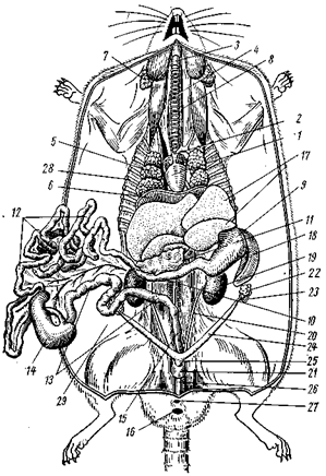 | Рис. 15. Общее расположение внутренних органов самки крысы: 1 – сердце, 2 – левая дуга аорты, 3 – гортань, 4 – трахея, 5 – легкое, 6 – диафрагма, 7 – околоушная слюнная железа, 8 – пищевод, 9 – желудок, 10 – двенадцатиперстная кишка, 11 – поджелудочная железа, 12 – тонкая кишка, 13 – толстая кишка, 14 – слепая кишка, 15 – прямая кишка, 16 – анальное отверстие, 17 – печень, 18 – селезенка, 19 – почка, 20 – мочеточник, 21 – мочевой пузырь, 22 – яичник, 23 – яйцевод, 24 – рог матки, 25 – матка, 26 – влагалище, 27 – половое отверстие, 28 – грудная полость, 29 – брюшная полость |