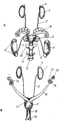 | Рис. 16. Мочеполовая система крысы. А – самец; Б – самка: 1 – почка, 2 – мочеточник, 3 – мочевой пузырь, 4 – надпочечник, 5 – семенник, 6 – придаток семенника, 7 – семяпровод, 8 – семенной пузырек, 9 – предстательная железа, 10 – куперова железа, 11 – препуциальная железа, 12 – половой член, 13 – яичник, 14 — яйцевод, 15 – воронка яйцевода, 16 – рог матки, 17 – матка, 18 – влагалище, 19 – половое отверстие |
