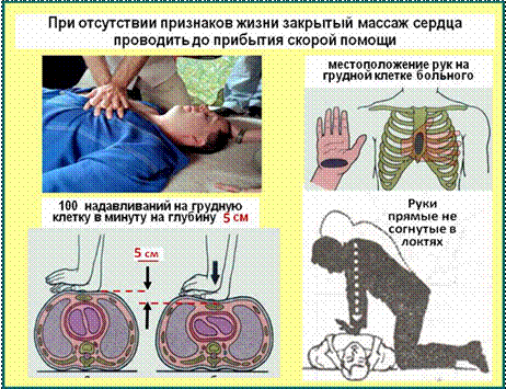 · При появлении признаков жизни (любые реакции, мимика, движения или звуки издаваемые больным), массаж сердца необходимо прекратить. При исчезновении указанных признаков жизни массаж сердца необходимо возобновить. Остановки массажа сердца должны быть минимальными – не более 5-10 секунд. При возобновлении признаков жизни массаж сердца прекращается, больному обеспечивается тепло и покой. При отсутствии признаков жизни массаж сердца продолжается до прибытия бригады СМП.