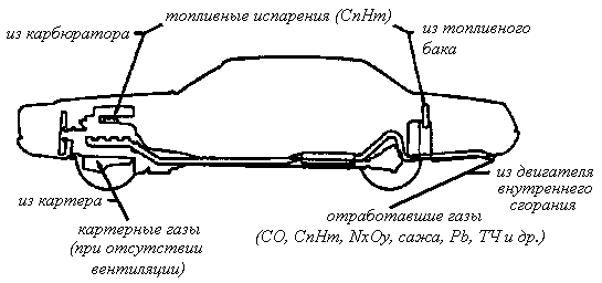 Источники основных токсичных веществ в выбросах автомобилей и их соотношение приведены на рис.3.1 и в табл.3.3.