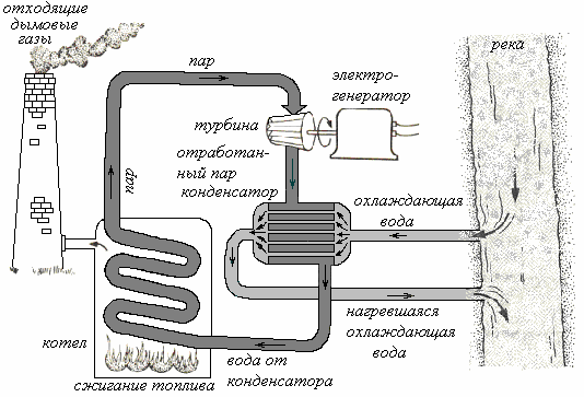 На ТПЭС тепловая энергия используется в парогенераторе для получения водяного пара высокого давления, приводящего во вращение ротор паровой турбины, соединённый с ротором электрического генератора. В качестве топлива на таких ТЭС используют уголь, мазут, природный газ, лигнит (бурый уголь), торф, сланцы. Их КПД достигает 40%, мощность – 3 ГВт. ТПЭС, имеющие в качестве привода электрогенераторов конденсационные турбины и не использующие тепло отработавшего пара для снабжения тепловой энергией внешних потребителей, называют конденсационными электростанциями (официальное название в РФ – Государственная районная электрическая станция, или ГРЭС). На ГРЭС вырабатывается около 2/3 электроэнергии, производимой на ТЭС.