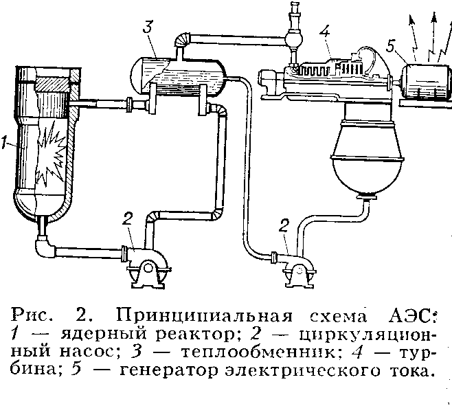 Принцип работы атомной электростанции и электростанций, сжигающих обычное топливо (уголь, газ, мазут, торф)одинаков: за счет выделяющегося тепла вода преобразуется в пар, который под давлением подается на турбину и вращает ее. Турбина, в свою очередь, передает вращение на генератор электрического тока, который преобразует механическую энергию вращения в электрическую энергию, то есть генерирует ток. В случае тепловых электростанций преобразование воды в пар происходит за счет энергии сгорания угля, газа и т. п., в случае АЭС - за счет энергии деления ядра урана-235.