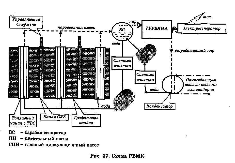 В российской (в советской) атомной энергетике получили распространение два типа реакторов: так называемые Реактор Большой Мощности Канальный (РБМК) и Водо-Водяной Энергетический Реактор (ВВЭР). На примере РБКМ рассмотрим принцип работы АЭС чуть более подробно.