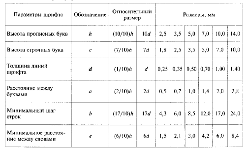 ГОСТ устанавливает следующие размеры шрифта: (1,8); 2,5; 3,5; 5; 7; 10; 14; 20; 28; 40.