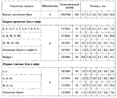 Таблица 6 – Размеры букв и цифр в мм.