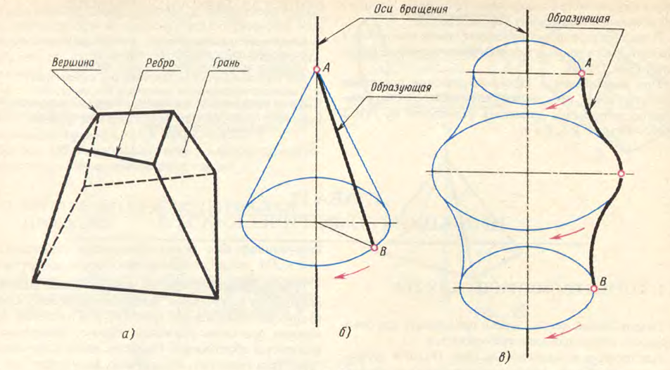 Тела вращения – геометрические тела, ограниченные поверхностями, которые получаются в результате вращения какой-либо линии вокруг неподвижной оси (цилиндр, конус, шар, тор) (рисунок 45б,в).