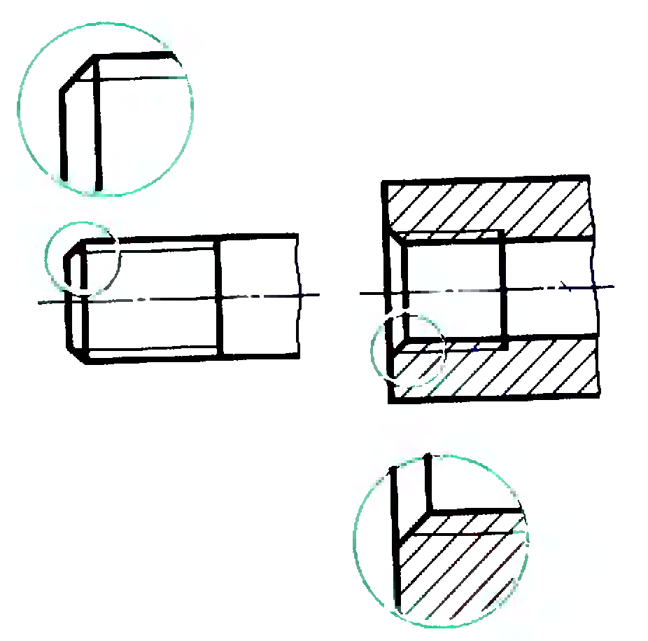 Сплошная тонкая линия изображения резьбы на стержне должна пересекать линию границы фаски (рисунок 91)