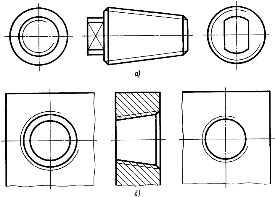 Фаски на стержне с резьбой и в отверстии с резьбой, не имеющие специального конструктивного назначения, в проекции на плоскость, перпендикулярную к оси стержня или отверстия, не изображают (рисунок 87).