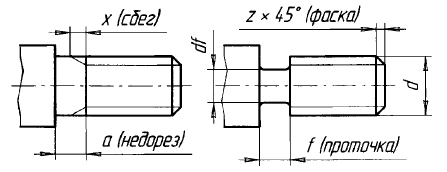 На рисунке 96 показаны такие технологические особенности при нарезании резьбы метчиками, плашками, фрезами и резцами: х — сбег резьбы, а — недорез резьбы, z — фаска, f — проточка.